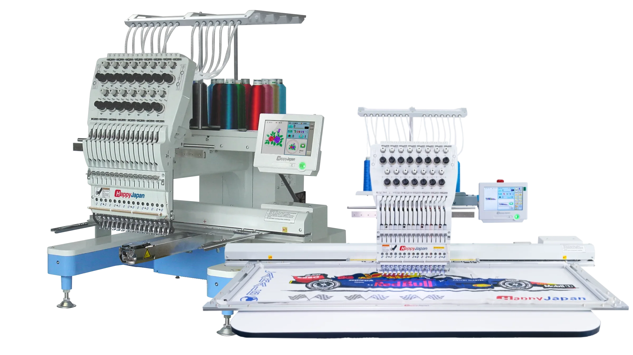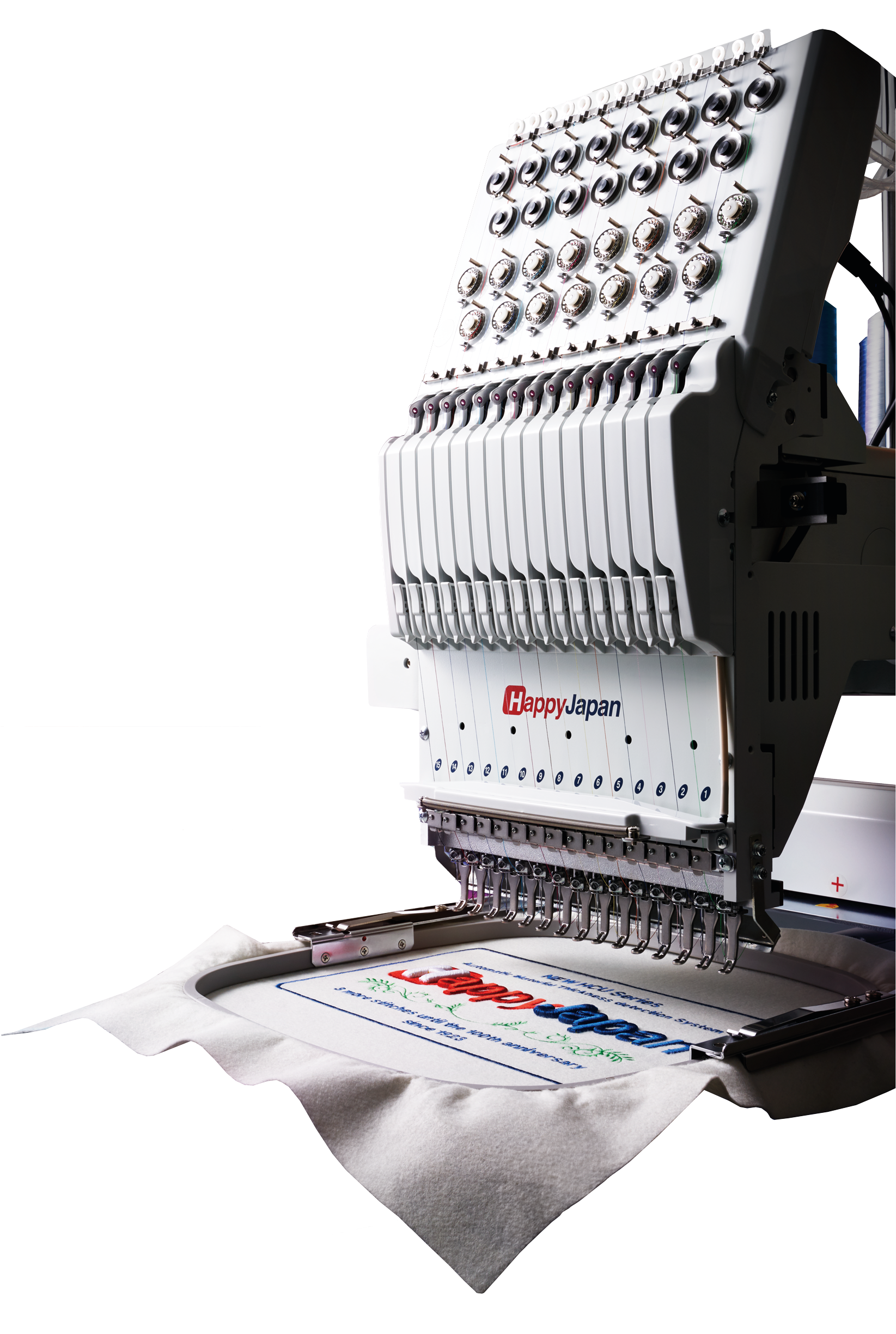 Průmyslové 2-12hlavé japonské vyšívací stroje HappyJapan jsou technologicky nejvyspělejšími vyšívacími stroji na světě. Díky kvalitním servomotorům tyto stroje vyšívají až 1100 stehů za minutu prakticky na veškeré materiály. Robustní konstrukce zaručí perfektní výšivku i na velmi silné materiály. Je už je na Vás zvolit správný počet vyšívacích hlav a velikost vyšívací plochy s čímž Vám velmi rádi pomůžeme.